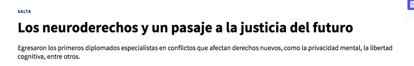 En Salta se dictó, para una breve cohorte de asistentes (2022/2023) y en la Escuela del Ministerio Público (EMP), una Diplomatura en Neuroderechos, que tuvo la originalidad de ser el primer espacio académico de enseñanza de tales nuevos derechos, a cargo de científicos, filósofos, eticistas y juristas de renombre, de distintas universidades. A su cierre, se presentó un trabajo final. La modalidad virtual permitió que también asistieran estudiantes de afuera de la ciudad de Salta. Obtuvimos nuestros diplomas diez personas, provenientes de la medicina, la psicología y la abogacía. Esto muestra la transdisciplina inexorable de la nueva temática. La dirección de la diplomatura estuvo a cargo del Dr. José Ángel Marinaro (exjuez de la Cámara Penal de San Martín, Provincia de Buenos Aires) y, los ejes del largo y denso programa, a cargo de diversos docentes que citaré a continuación. Así, tuvimos el gusto de escuchar a: José Ángel Marinaro, Adrián Ramírez, Guillermo Scaglione, Abel Wajnerman Paz, Arleen Salles, Ezequiel Mercurio, Martín Javier Mazzoglio y Nabar, Guillermo Jemar, Waldo Sobrino y Ramiro Gutiérrez (argentinos); José Manuel Muñoz (español); Eric García López, Aura Itzel Ruiz Guarneros (mexicanos); José Carlos Porciúncula, Renato César Cardoso (brasileños); Diego Borbón (colombiano); María Isabel Cornejo Plaza (chilena).