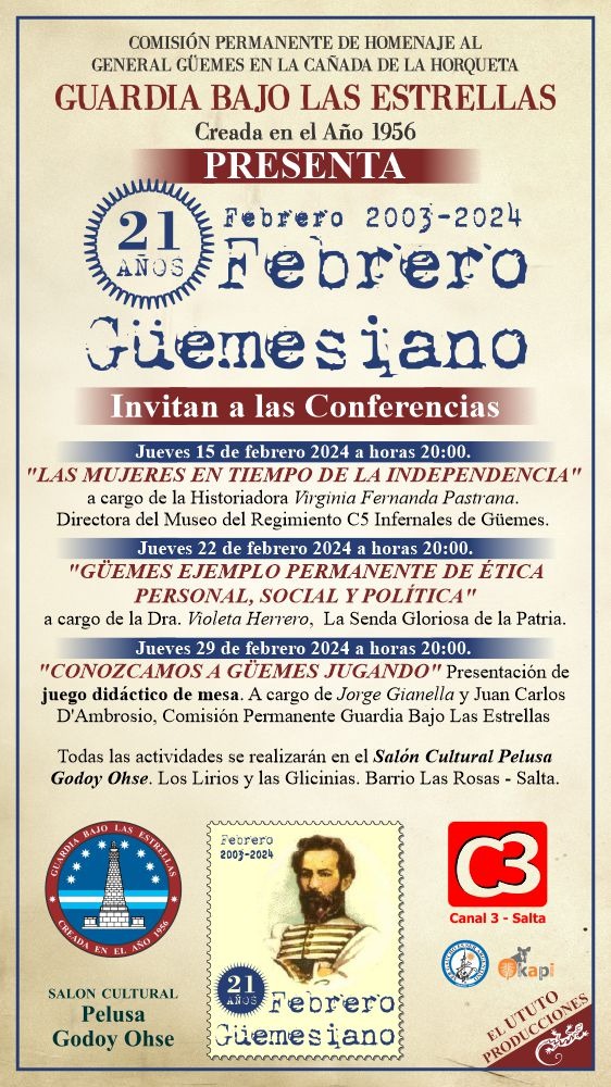 A la vez, aprovecho esta ocasión, queridos amigos, para comentar que el jueves 22 de febrero, a hs. 20, estaré dando una charla, “Güemes, ejemplo permanente de ética personal, social y política”, invitada por Canal 3 y el Sr. Jorge Gianella, Presidente de la Comisión Permanente Guardia bajo las Estrellas, quien, valga la referencia, es asimismo miembro y sitial académico de La Senda Gloriosa de la Patria. Ello, en Barrio Las Rosas, ciudad de Salta, y dentro del emotivo marco del Febrero Güemesiano. Acompaño a este post un flyer que da cuenta de sus actividades.
