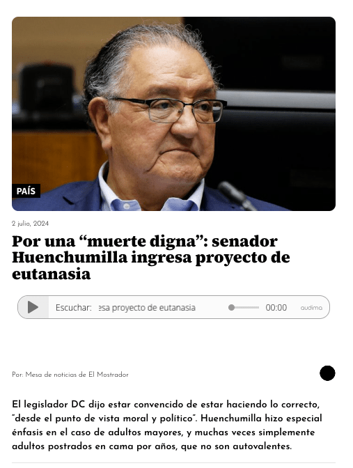 Recientemente, el senador Francisco Huenchumilla (DC) ingresó al Senado un proyecto de reforma constitucional que busca legalizar la eutanasia en Chile, bajo el predicamento de otorgar a las personas el “derecho a una muerte digna” y el “derecho de las personas a tomar decisiones libres e informadas sobre sus cuidados y tratamientos al final de su vida”.