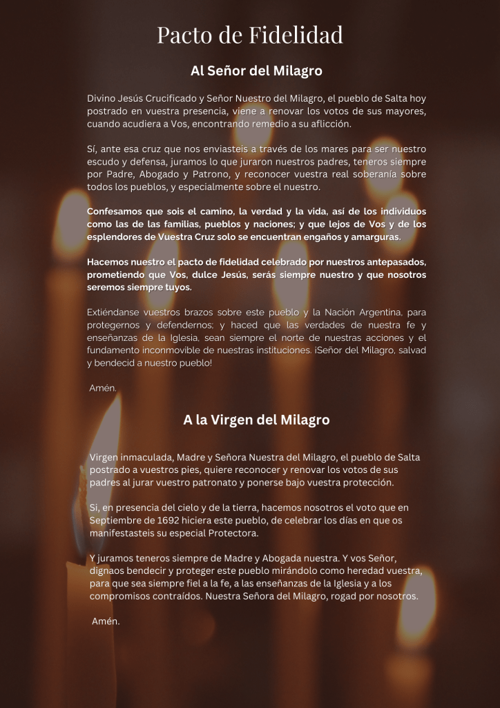 Desde 1692, cada 15 de septiembre, el pueblo de Salta se une en un vínculo sagrado con sus santos patronos tutelares, el Señor y la Virgen del Milagro. En una emotiva ceremonia que congrega a más de 850 mil fieles, la ciudadanía salteña pronuncia su Pacto de Fidelidad en un gesto de amor y esperanza.