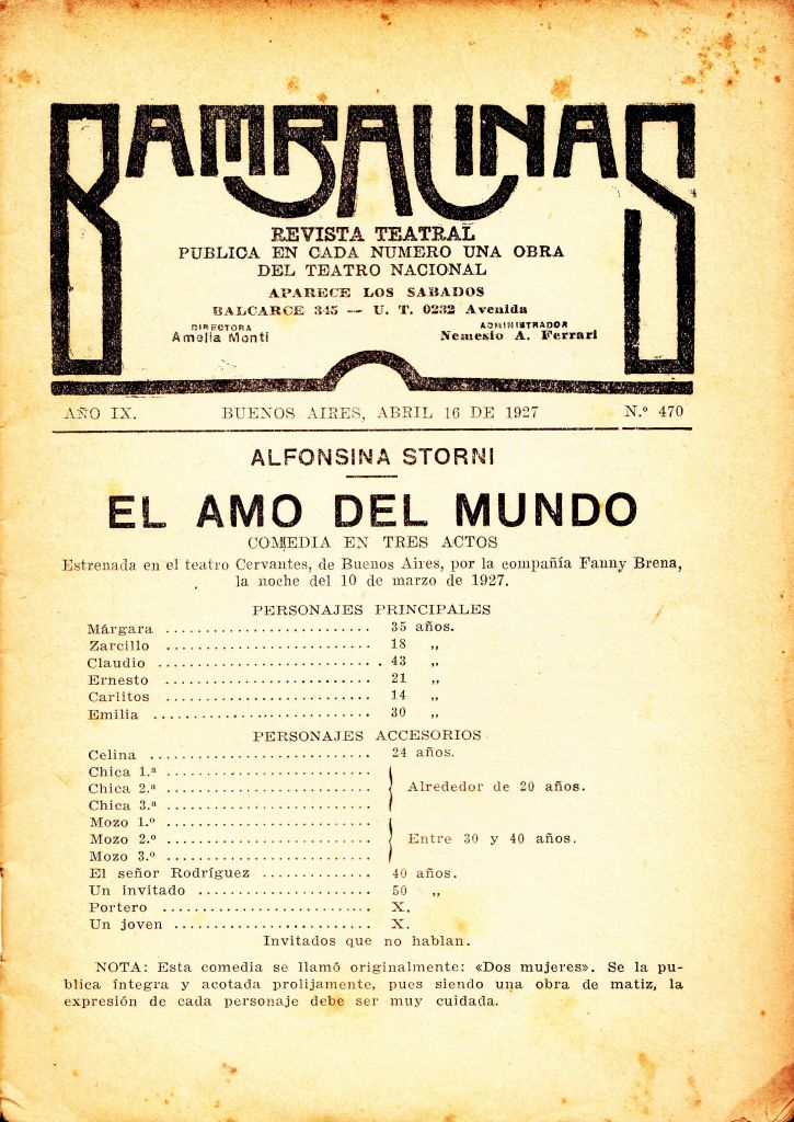 El amo del mundo se estrenó en 1927 por la Compañía Argentina de Comedias de Fanny Brena, con dirección artística de Juan León Bengoa, en el Teatro Cervantes. Contó con el primer actor Alejandro Flores, chileno, con Guillermo Battaglia, Pedro Laxalty el niño actor René Cossa, entre otros. Esta obra es la única pieza teatral que Alfonsina Storni estrenó.