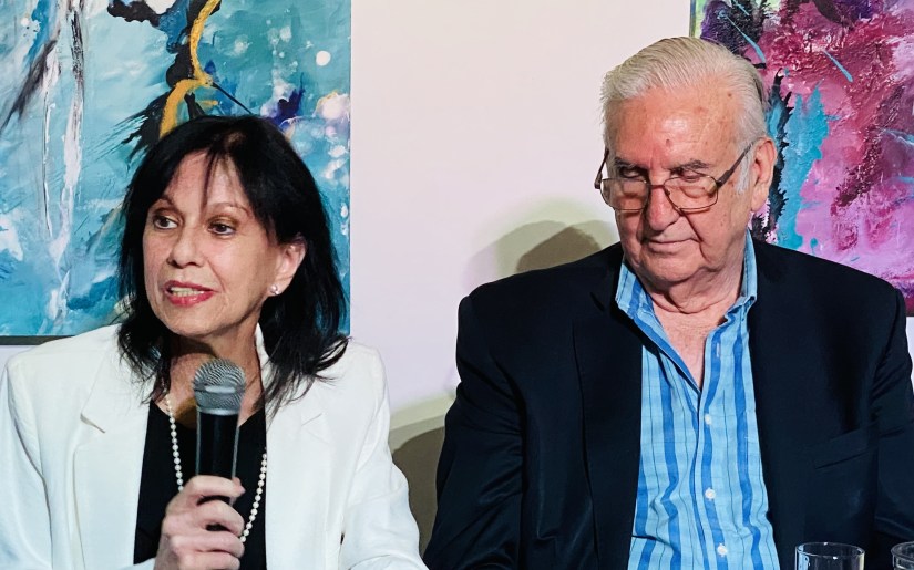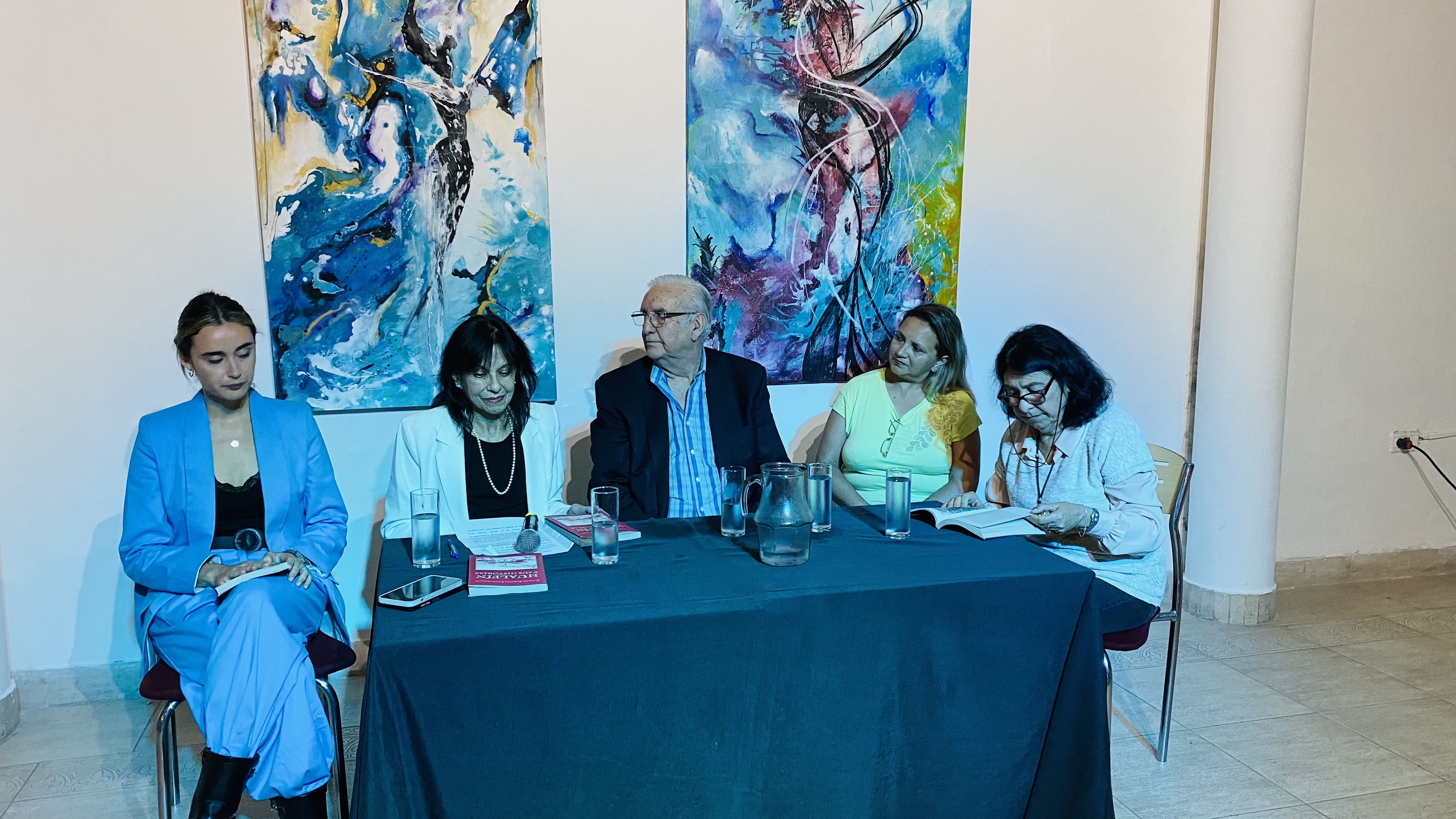 El autor se ubicó en el centro de la mesa-panel y, a ambos lados, las cuatro mujeres que de un modo u otro lo apoyamos durante los dos años que llevó la concreción de la obra.