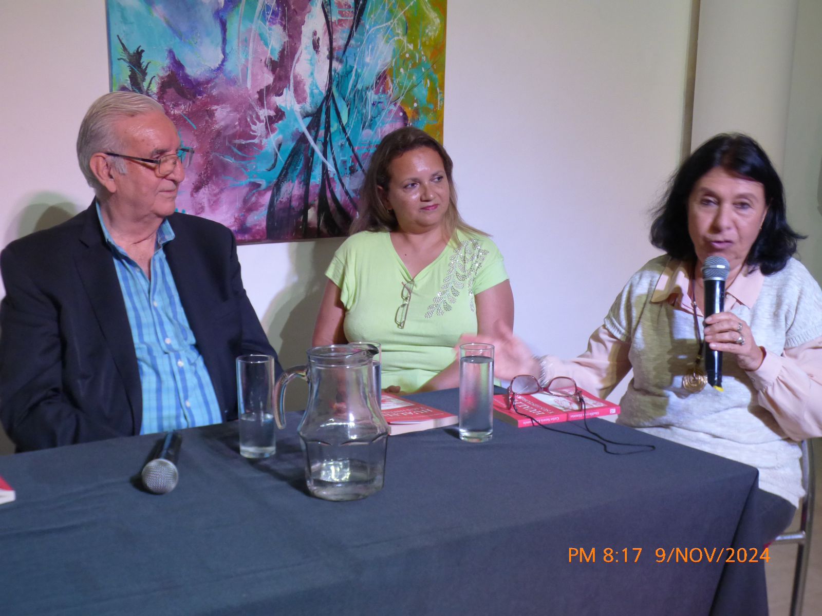 Delfina Saa Saravia, primera a la izquierda de la foto, nieta del autor, escribió su prólogo, el cual leyó en el acto; a su lado, me tocó decir algunas palabras que me permitiré reproducir a continuación; luego escuchamos a la Profesora Patricia Cabezas, también al lado del autor, la cual trabajó con él cada día y, por fin, a la Profesora María Eugenia Carante, quien ejerció labores de consejo, corrección y sugerencias editoriales.