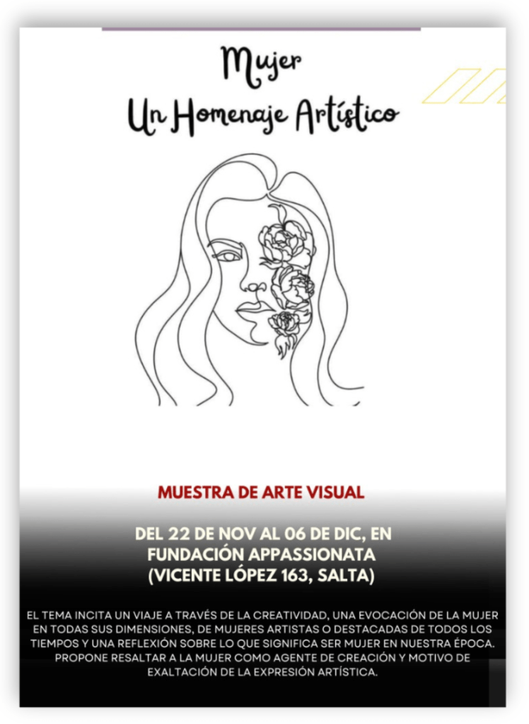 Hoy es el último día para visitar la muestra de arte Mujer, un Homenaje Artístico, organizado por Comisiones de Género y de Cultura del Colegio de Magistrados y Funcionarios de Salta. La muestra se exhibe en Appassionata, calle Vicente López 163 de la ciudad de Salta, con motivo de la semana conmemorativa del Día Internacional de la Eliminación de la Violencia contra la Mujer que se celebra cada año el 25 de noviembre. Estará abierta hasta el 6 de diciembre de 2024.