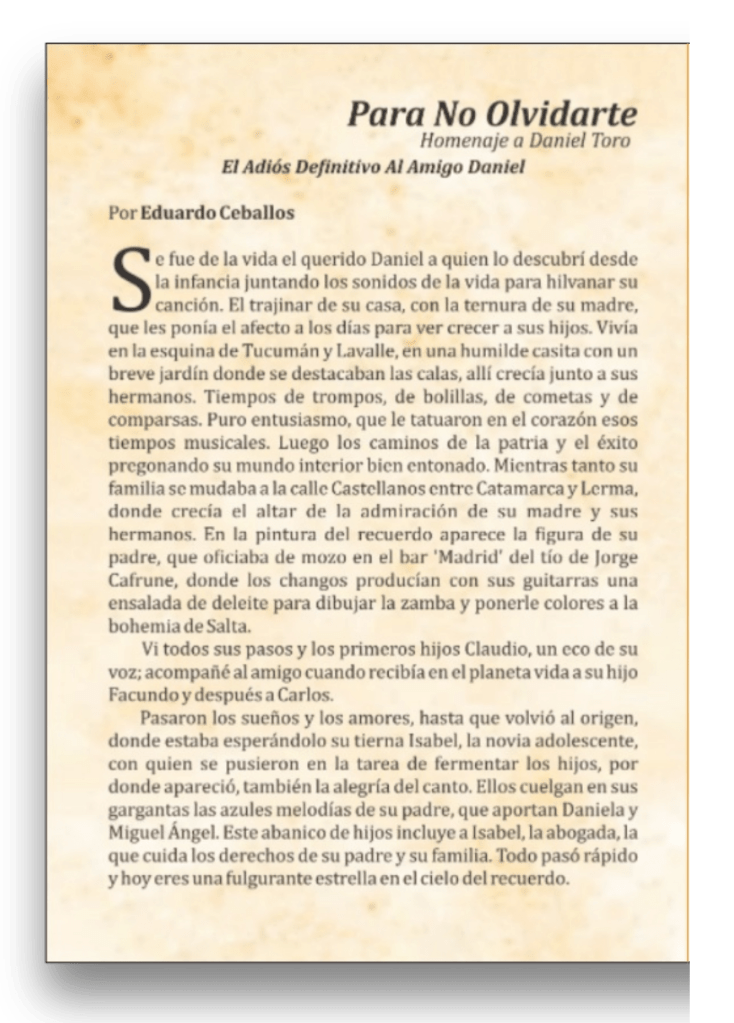 El año 2.025, recién asomando a nuestras vidas, y ya nosotros haciendo «líos culturales» con la presentación del libro PARA NO OLVIDARTE en homenaje a Daniel Toro, nuestro cantautor salteño.
