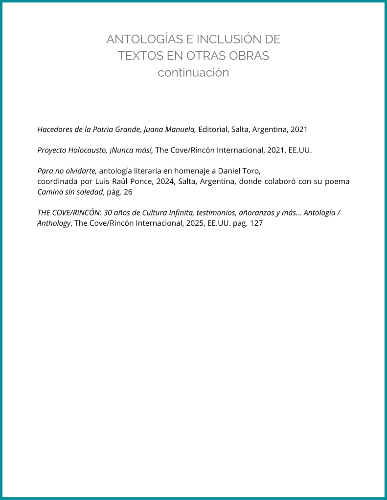 Pero su producción literaria de cuentos, novelas y ensayos no se queda atrás, totalizando treintaicuatro títulos publicados; por su parte, hizo lo propio con catorce poemarios, siendo el más reciente Desfiladero, -marzo de 2025-.