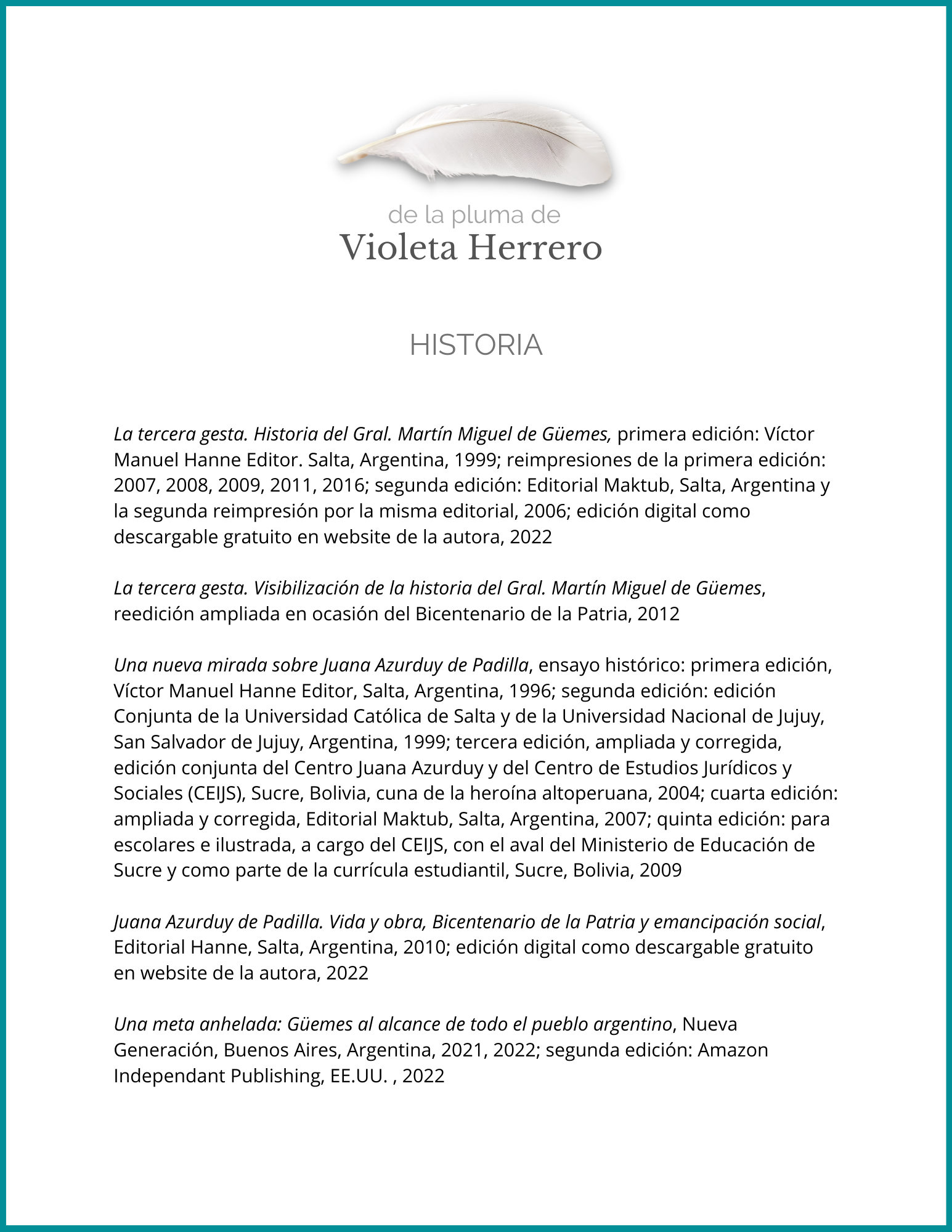 El ensayo Una nueva mirada sobre Juana Azurduy de Padilla cuenta con cinco ediciones desde su fecha de publicación en 1996, en su ciudad y en Sucre, cuna de la heroína. A su vez, su unipersonal de teatro Juana Azurduy. Una Revolución Inconclusa fue estrenada en Salta, Argentina, en 2008, e incluida en Mujeres de la Patria Grande, publicación de 2019 en coautoría con el conocido dramaturgo y director argentino Mario Cura. Todavía sigue interpretándose en su país. En algunos lugares de América Latina se representó como teatro en la calle.